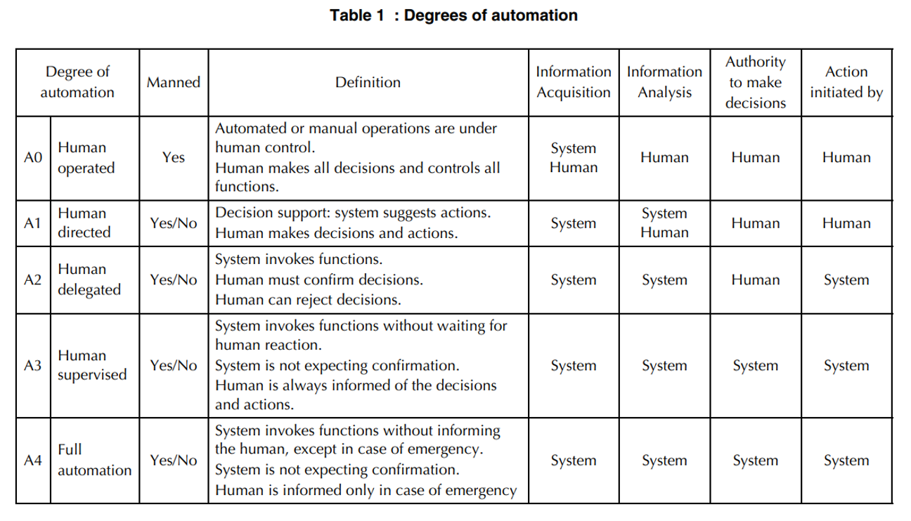 For example, at Bureau Veritas, the degree of automation (table 1) is defined as the degree of decision-making that has been transferred from humans to the system. Thus, a system is said to be A0 when humans make all decisions and control all functions of the system, and on the other hand, a system is A4 when it invokes functions without informing the human, except in emergencies. The system does not wait for confirmation; the human is only informed in case of emergency. Hence the autonomous ship.